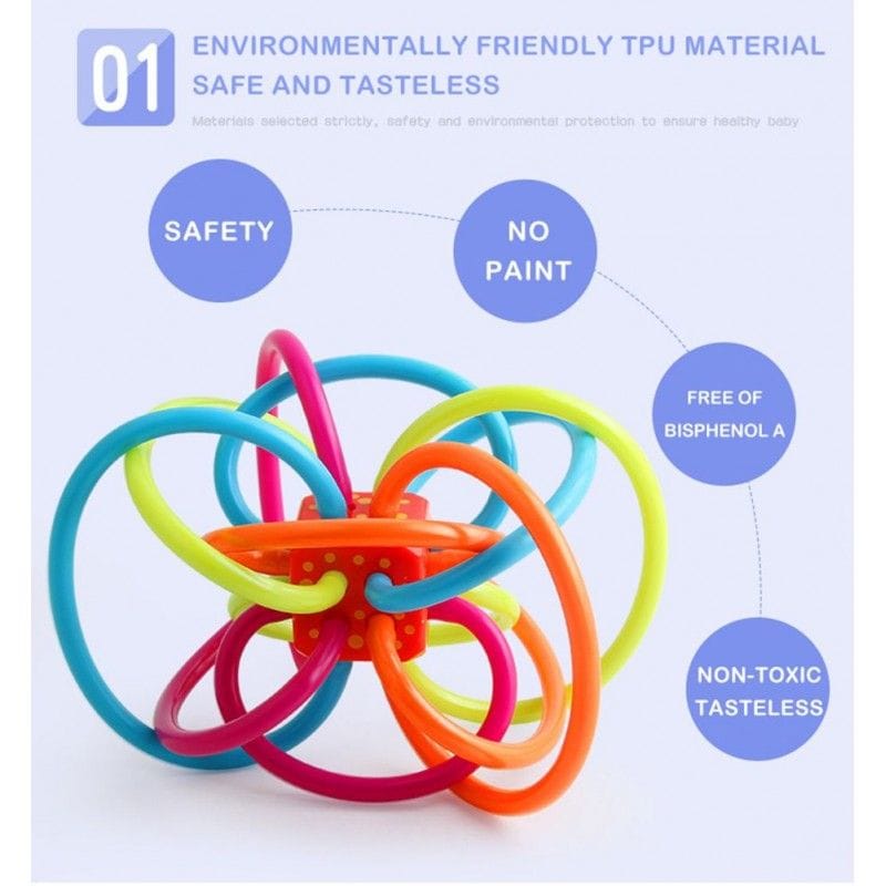 Realizata din material non-toxic, eco-friendly, sigur si fara gust, fara bisphenol A, jucaria este elastica si poate fi manuita in toate directiile dorite de catre bebe, chiar muscata si rontaita, fara ca acesta sa fie in pericol.