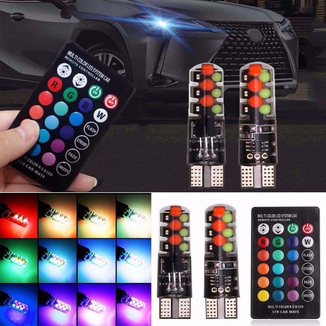SET 2 BECURI DE POZITIE LED RGB CU TELECOMANDA , Oferte Shop Becuile se monteaza usor, telecomanda va schimba culoarea si intensitatea luminii. LED-ul se poate folosii ca si luina ambientala in pozitie far, plafoniera, diverse aplicatii. Tuturor ne place sa cream o lumina ambientala placuta. Acest produs este un gadget deosebit pentru tuning auto interior. Puteti sa-l faceti si cadou oricui pasionat de masini si tuning, da nu numai. Dispune si de telecomanda, astfel incat puteti seta culoarea dorita sau puteti programa mai multe functii de iluminat. LED-urile au un consum mult mai mic decat al becului incandescent dar si o durata de viata mult mai mare. Lumina data este cu mult mai puternica decat cea emisa de becul normal. Acestea se pot monta oriunde in autovehicul sau in casa, alimentate la 12v. Emite o lumina calda, combinand cele 3 culori de baza (rosu, verde, albastru) in 16 nuante coloristice diferite. Poate fi pornit/oprit din telecomanda. Are posibilitatea de a oferi jocuri de lumini la alegere sau poate lumina o singura culoare la alegere, prin apasarea butonului corespunzator de pe telecomanda. Se poate ajusta si intensitatea luminii din telecomanda. Programe: schimbare alternativa a culorilor, schimbare de culoare, dimming efect (stralucire) si un efect de stroboscop. Capacitatea de a alege orice culoare de banda de lumina. Reglarea luminozitatii si viteza programului. Control facil, prin telecomanda. 12 culori si 4 functii independente. Reglaj: ON/OFF, Intensitate luminii in trei pozitii. Functii: Flash, Srobe, Fade, Smooth. Functie On/Off. MODEL LED: T10 6 LED SMD 5050 – SILICA CULOARE: R.G.B. Tensiune: 12V. Include: Telecomanda